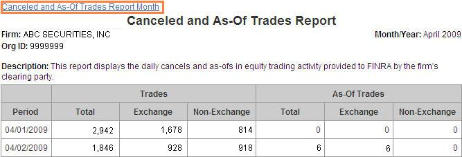 This report displays the daily cancels and as-ofs in equity trading activity provided to FINRA by self-clearing firms and clearing firms on behalf of their correspondents, as required by FINRA Rule 4540. The Daily View may be accessed by clicking the month hyperlink for the month you wish to view. The user may return from the Daily View to the Monthly Report by clicking the "Canceled and As-Of Trades Report Month" hyperlink at the top of the Daily View.