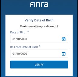 A24: Yes. You will need to provide your DOB to FINRA as it is used to match against the DOB captured and verified through ID.me. FINRA will not store your DOB and will only use it during the identity verification process. You will be required to enter your DOB and then re-enter it to validate accuracy.