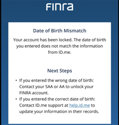 A25: If you completed identity verification through ID.me but received a Name Mismatch error, this means the information in your FINRA Entitlement account does not match what was verified through ID.me.