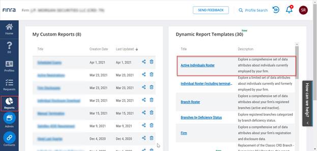 Log in to FINRA Gateway, navigate to the Reports tab, and open the Active Individuals Roster template.